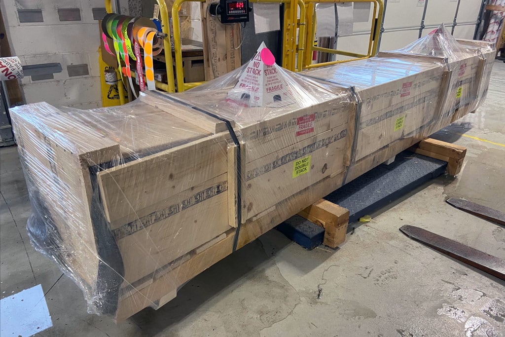 Using protective sheets between layers, each package is placed on a skid. We create a stable wooden fully enclosed crate that properly protects EPS items. Once the wooden crate is full, we stretch wrap it, apply stickers and no stack cones, while indicating “this side up” and “fragile” to indicate to carriers that extra caution should be used during handling and transport.